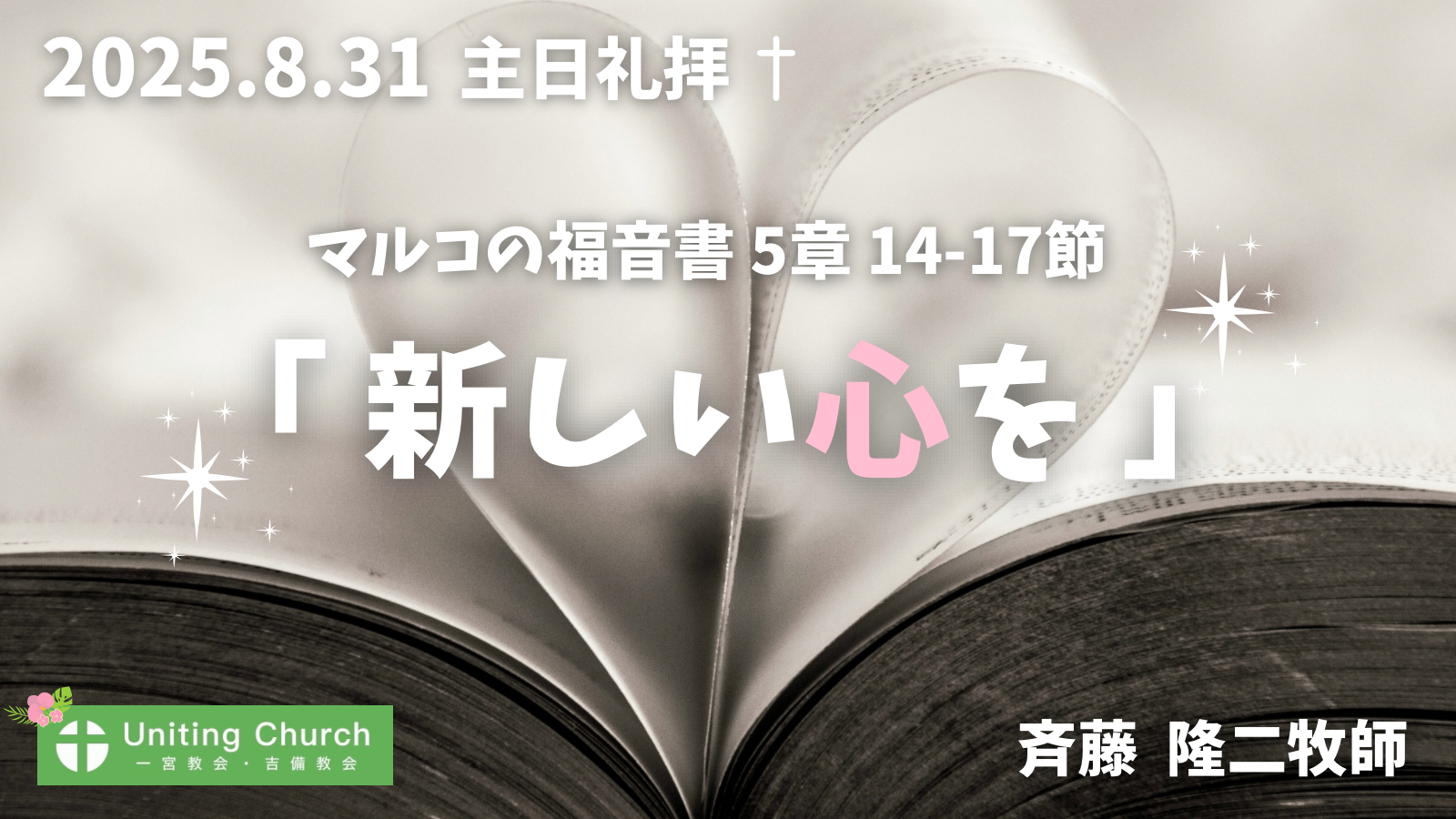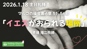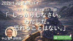説教録音(Podcast) 本日の礼拝 よかったらシェアしてください URLをコピーしました! 受講者レポート(三回シリーズ)/「入門クラスを終えて③」<個人的なこと> まるで、みつかいのように 関連記事 【録画】主日礼拝「しっかりしなさい。わたしだ。恐れることはない。」/マタイの福音書14章22-33節/中山聖一郎牧師/2026年1月25日 2026年1月25日 【録画・録音】主日礼拝「イエスがおられる場所」/マルコの福音書6章51-56節/斉藤隆二牧師/2026年1月18日 2026年1月18日 【録画・録音】主日礼拝「しっかりしなさい。わたしだ。」/マルコの福音書6章45-50節/斉藤隆二牧師/2026年1月11日 2026年1月11日 【録画・録音】元旦礼拝「どんなことでもできるのです」/ピリピ人への手紙4章12-13節/斉藤隆二牧師/2026年1月1日 2026年1月1日 【録画・録音】主日礼拝「パンはいくつありますか」/マルコの福音書6章35-39節/斉藤隆二牧師/2025年12月28日 2025年12月28日 【録画】クリスマスイブ礼拝「私と共に生きるために」/黙示録3章20節/斉藤隆二牧師/2025年12月24日 2025年12月24日 【礼拝録画・録音】クリスマス礼拝「神の御姿であられるのに」/ピリピ人への手紙2章6-9節/斉藤隆二牧師/2025年12月21日 2025年12月21日 【礼拝録画・録音】アドベント2「その時が来れば実現する」/ルカの福音書1章5-20節/斉藤泉牧師/2025年12月7日 2025年12月7日 コメント コメントする コメントをキャンセルコメント ※ 名前 ※ メール ※ サイト 次回のコメントで使用するためブラウザーに自分の名前、メールアドレス、サイトを保存する。